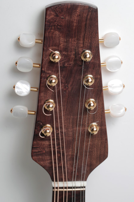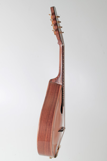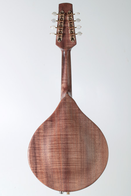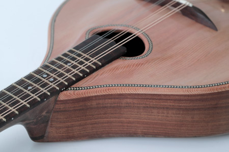 This mandolin is particularly loud, I would even say powerful, across all strings and notes. The tone is very warm and the chords are very satisfying. The nut is 31.5 mm and the neck has a soft V shape which ensures comfort for long periods of playing. As with all my instruments, the top and back are carved, the back sides and neck are all of the same timber, and finish is clear so you see the natural features of the wood.