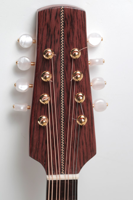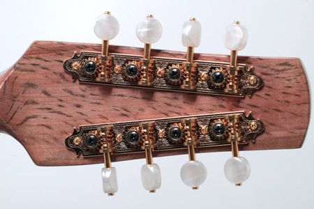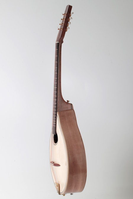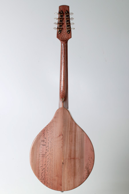 This is a fully carved octave mandolin with a slightly deeper carved Swiss spruce soundboard. It has a very (very!) loud, rich and deep tone that is well balanced across all strings. It is the best sounding octave mandolin I have played. The deep Swiss spruce 'moonwood' and the tiger myrtle back makes it very resonant, producing natural reverb and long sustain. The sound is superb through my AER amplifier with the K&K pickups really doing it justice. It measures 32 mm at the nut and has a nicely figured neck that matches the body.