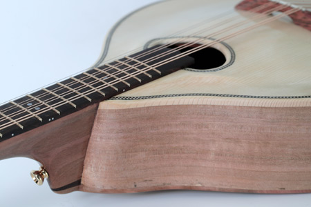 This is a fully carved octave mandolin with a slightly deeper carved Swiss spruce soundboard. It has a very (very!) loud, rich and deep tone that is well balanced across all strings. It is the best sounding octave mandolin I have played. The deep Swiss spruce 'moonwood' and the tiger myrtle back makes it very resonant, producing natural reverb and long sustain. The sound is superb through my AER amplifier with the K&K pickups really doing it justice. It measures 32 mm at the nut and has a nicely figured neck that matches the body.